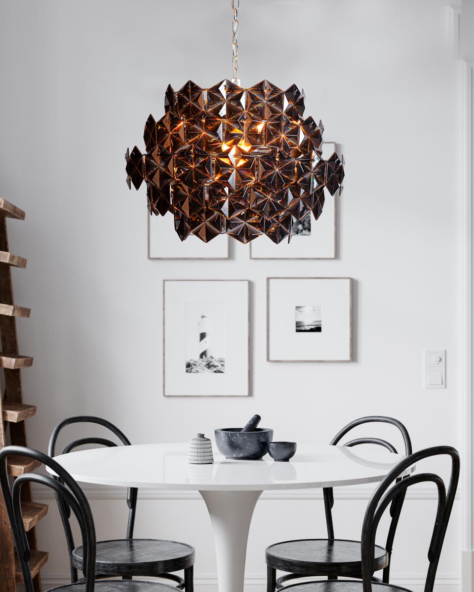 Monarque Mini er en elegant taklampe som kombinerer klassisk design med moderne følelse. De vakkert formede prismene i akryl, tilgjengelige i både klare og svarte varianter, fanger og reflekterer lyset på en effektfull måte. Når lampen er tent, skapes et gnistrende og stemningsfullt lys som gir rommet en eksklusiv karakter. Opphenget i kromkjede forsterker lampens sofistikerte uttrykk og gjør den til et stilfullt innslag over spisebordet, i gangen eller stuen. Monarque Mini er det perfekte valget for deg som ønsker å tilføre eleganse, lys og personlighet til hjemmet.