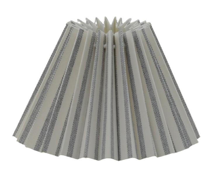 Nydelig plisséskjerm i hvit og blå stripete stoff.
