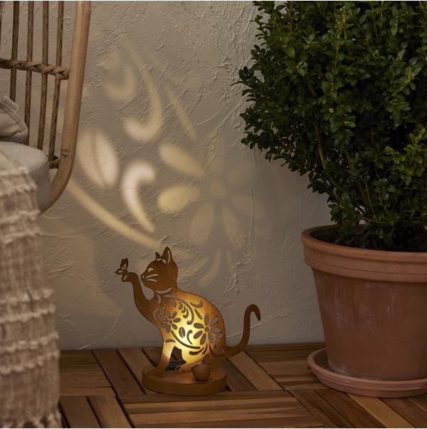 Oxidcat er en flott dekorasjon for trapper, blomsterbed eller balkonger, og er like vakker opplyst som uten lys. I mørket lyser den opp med en varm hvit glød, og hvis den plasseres inntil en vegg, skaper den en vakker skyggeeffekt. Plasser belysningen der solen kan nå panelet på dagtid for å få optimal lading av det medfølgende batteriet.