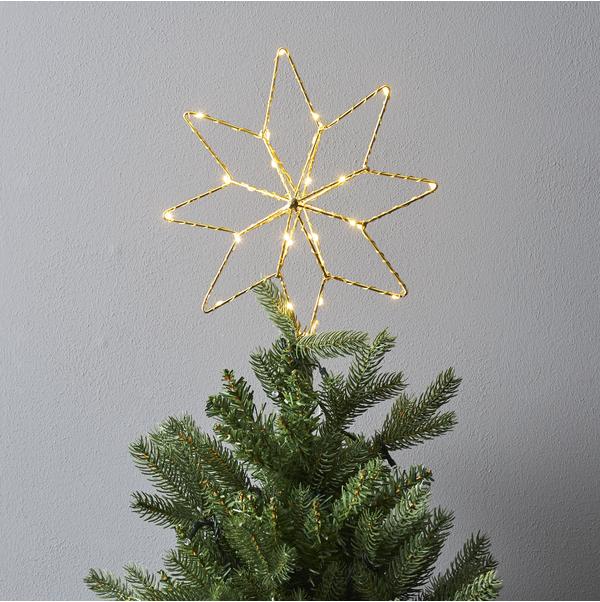 Stilren toppstjerne til juletreet. Batteridrevet og med klemme for enkel montering på juletreet.